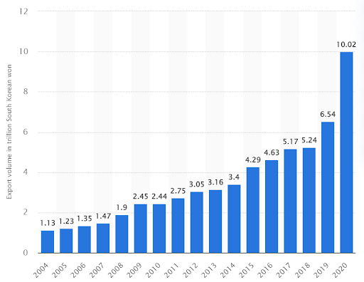 Figure 3: Export volume of the biotechnology industry from South Korea from 2004 to 2020 (in trillion South Korean won), source: Invest Korea, Growth of the Entire Bioindustry, 2020