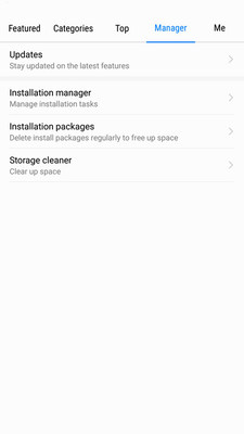 หน้า Manager มีไว้ให้ผู้ใช้งานอัปเดตและจัดการแอปของตนเอง ประกอบด้วยฟังก์ชั่นอัปเดตแอป จัดการการติดตั้ง จัดการแพคเกจการติดตั้ง และเคลียร์พื้นที่จัดเก็บข้อมูล เมื่อเปิดโหมด "Auto-update over WLAN" ตัว AppGallery จะทำการอัปเดตแอปอย่างสม่ำเสมอโดยอัตโนมัติ เมื่ออุปกรณ์เชื่อมต่อกับสัญญาณ WiFi และกำลังชาร์จแบต ทำให้ผู้ใช้สะดวกสบายไร้กังวล