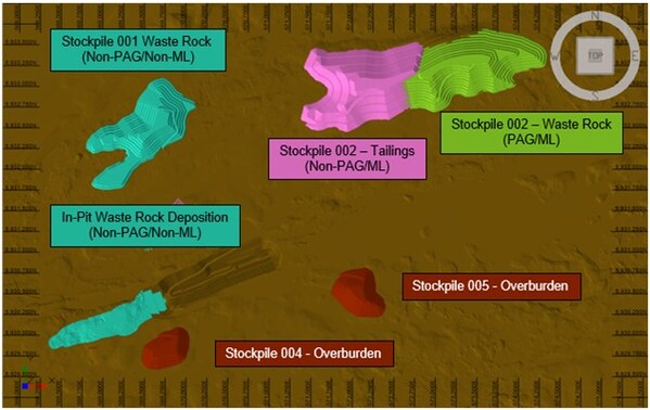- Stockpile 002 will be fully lined to account for the metal-leaching potential (As) of the tailings stored in the facility and for the potentially acid-generating nature of waste material stored in the facility. The construction, operation and closure of this lined facility (including the water management aspect of its design and operation) is fully costed in the Feasibility Study.