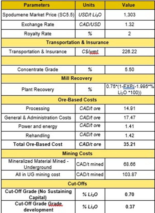 - Revenues for the economic model are estimated using a long-term metal price of USD 1,221 /t Li2O for a spodumene concentrate at 5.5% Li2O (equivalent to USD 1,332 /t Li2O for a spodumene concentrate at 6.0% Li2O) and an exchange rate of CAD/USD 1.34. Concentrate transport is 217.19 CAD/t (dry) of concentrate. No treatment charges are applied. No penalties are applied.