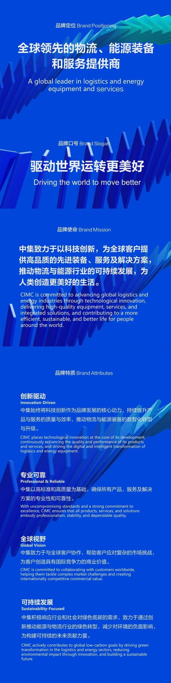 At the center of the new logo is the sky-blue diagonal stroke within the letter "M," which serves as the logo's defining visual element. It symbolizes technological innovation and sustainability, embodying the spirit of continuous advancement and innovation. Its upward, forward-leaning orientation reflects CIMC's commitment to resilience and the pursuit of excellence. The Chinese logotype has also been redesigned to convey a more modern and robust presence. Notably, a redesigned angular cut in the first character of the Chinese name has been incorporated to create a clean, assertive visual form that reinforces CIMC's brand theme of "driving the world to move better," while underscoring the strength and technological capability associated with an industry leader.